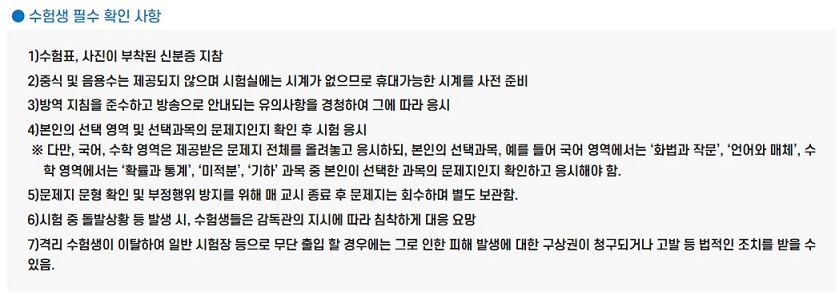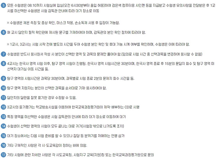 - 모든 수험생은 08:10까지 시험실에 입실(오전 6시 30분부터 출입 허용)하여 수험생 유의사항을 전달받은 후 1교시를 미선택한 수험생은 시험 감독관 안내에 따라 대기 장소로 이동합니다.