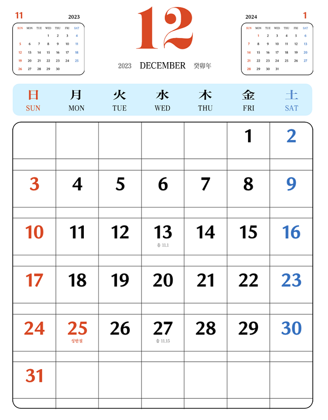 2023년도 이제 마지막인 12월입니다. 지나간 한해를 마무리하는 동시에 새로운 한해를 준비해야 하는 달입니다. 2023년 초에 계획하신 것들을 모두 이루셨길 바라며 또 새롭게 다가오는 2024년의 계획을 미리 세워보길 바랍니다.