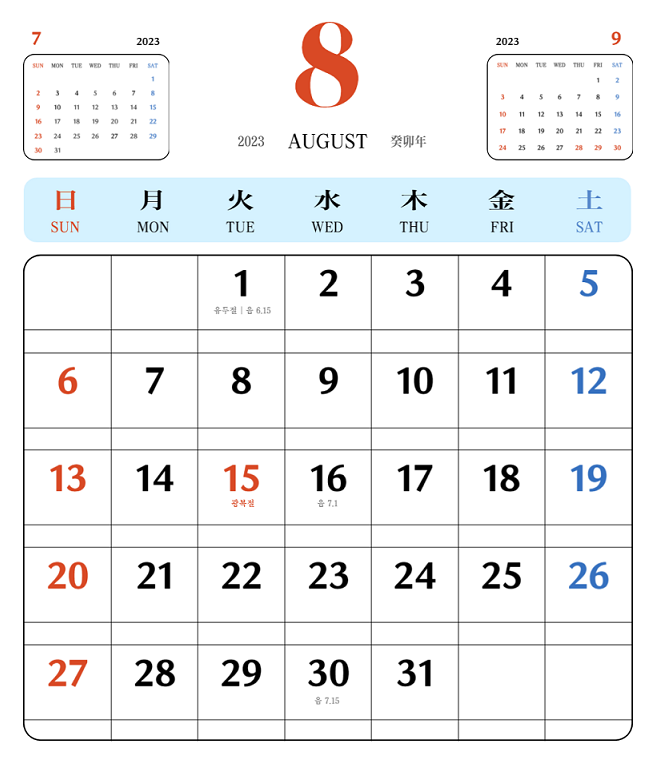 8월 달력 및 공휴일
