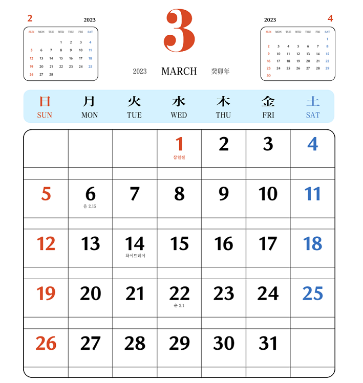 - 3월 : 3.1절(1일) 금요일