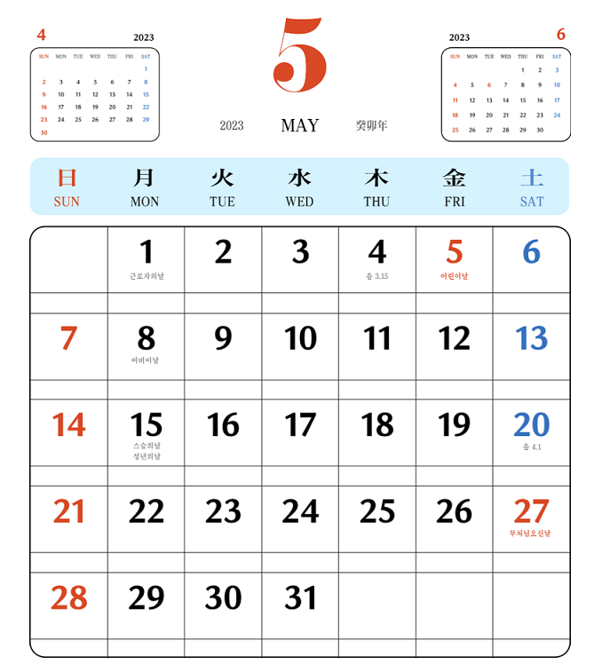 - 5월 : 어린이날(5일) 일요일, 석가탄신일(15일) 수요일