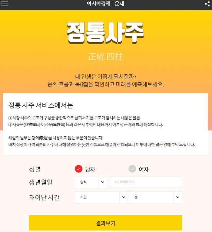 아래와 같이 토정비결과 정통사주도 간단한 사주정보만 입력하면 확인하실 수 있습니다.