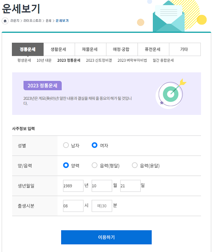 아래외 같이 2023 정통운세를 클릭하면 정보를 입력하고 이용하기를 눌러줍니다.