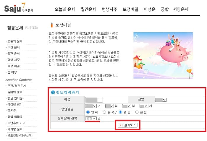 사주를 입력 후에 운세보기를 클릭하면 2023년 운세를 무료로 보실 수 있습니다.